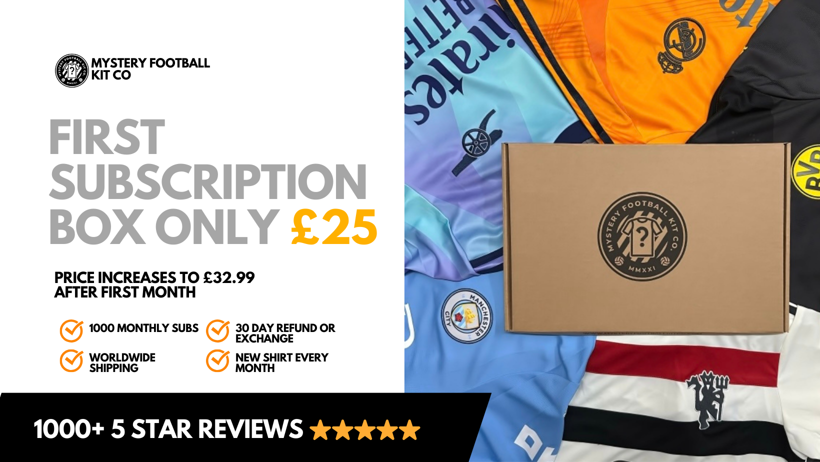 The ultimate destination for authentic mystery football kit boxes. Specializing in surprise selections of genuine football shirts from clubs and national teams worldwide, our curated boxes offer a fun and unique way to expand your football shirt collection. Whether you're a die-hard fan or looking for the perfect gift, our range includes options for men, women, kids, and even jumbo boxes. With over 100,000 football shirts sold, we pride ourselves on fast, tracked shipping and exceptional customer service worldwide. Plus, with exclusive offers like Free Kit Fridays, Mystery Football Kit Co brings excitement and value right to your doorstep. Let the box decide your next favorite football kit and join a community of satisfied collectors today.